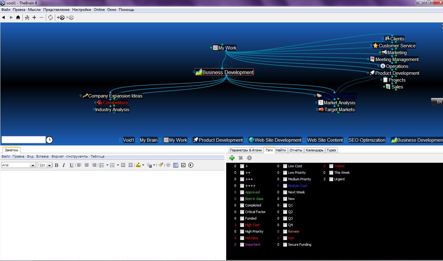 Этот весьма производительный редактор для составления карт стратегического планирования, мозгового штурма, анализа и планирования, который помогает визуализировать, управлять и делиться своими знаниями или идеями. Программа для создания интеллектуальной карты имеет простой и удобный интерфейс, который обеспечивает эффективный способ мозгового штурма.